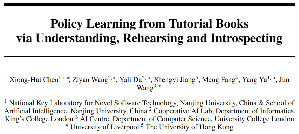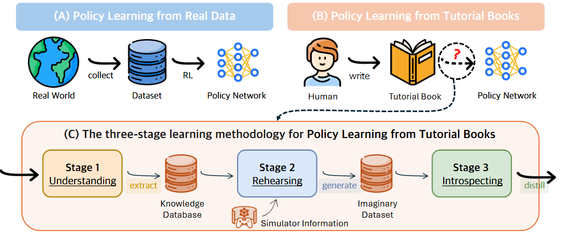 강화학습은 일반적으로 환경과 상호작용하면서 데이터를 수집하고, 이를 바탕으로 에이전트를 학습시키는 방식으로 이루어져 왔다. 그러나 사람이 새로운 기술을 배우는 상황을 떠올려 보면, 직접 시행착오를 겪기 이전에 “교과서”나 “튜토리얼 책”을 통해 지식을 습득하고 이를 머릿속에서 리허설(Rehearse)해보는 과정을 거친다. 이 논문에서는 이러한 인간의 학습 방식을 모사해, 환경과 직접 상호작용하지 않고도 “튜토리얼 책”에 담긴 지식을 활용해 정책을 학습하는 Policy Learning from tutorial Books(PLfB) 문제를 새롭게 제시하고, 이를 해결하기 위한 URI(Understanding, Rehearsing, Introspecting) 프레임워크를 제안한다.