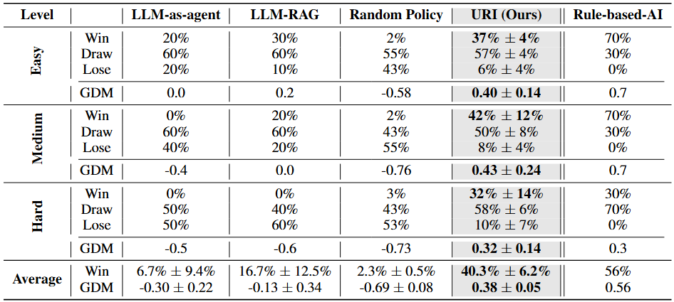 - URI가 LLM-as-agent 대비 net win rate +66%, LLM-RAG 대비 +44% 등으로 크게 우세.