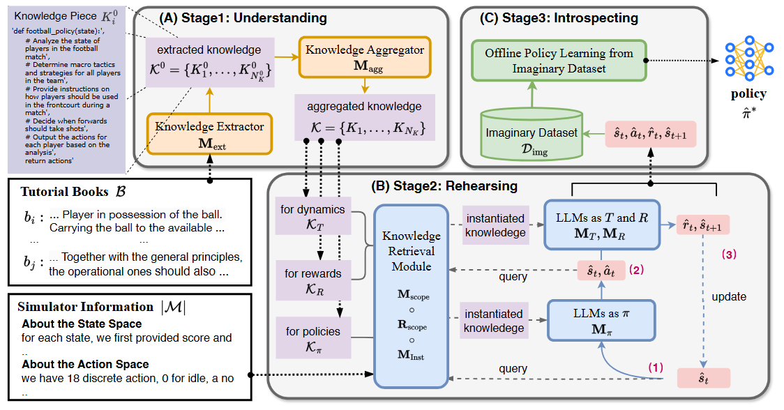 PLfB를 달성하려면, 사실상 게임(또는 환경) 룰, 정책(전략), 보상 등에 대한 정보가 텍스트에 잘 정리되어 있어야 한다. 하지만 텍스트 형태로 된 문서를 곧바로 강화학습 정책으로 바꾸는 것은 쉽지 않다. 저자들은 이 문제를 풀기 위해서, 마치 사람이 책을 읽고 상상 연습을 한 뒤, 그 결과를 복기하면서 스스로를 교정하는 과정을 흉내 내는 세 단계 접근법을 개발했다.