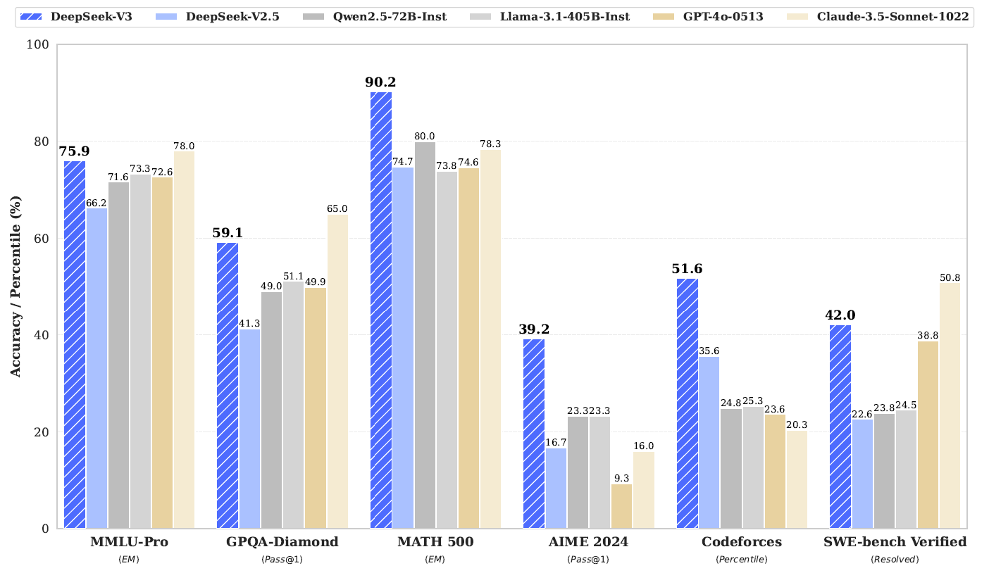 영어 기반 MMLU, MMLU-Pro, TriviaQA, NaturalQuestions 등에서 DeepSeek-V3는 기존 오픈소스 모델보다 높은 정확도를 기록했다. 또한 프롱프팅을 통한 multiple-choice 테스트, reasoning 테스트에서도 경쟁 모델을 크게 앞섰다. 중국어 관련 C-Eval, C-SimpleQA 등에서도 우수한 성능을 보여주었다.
