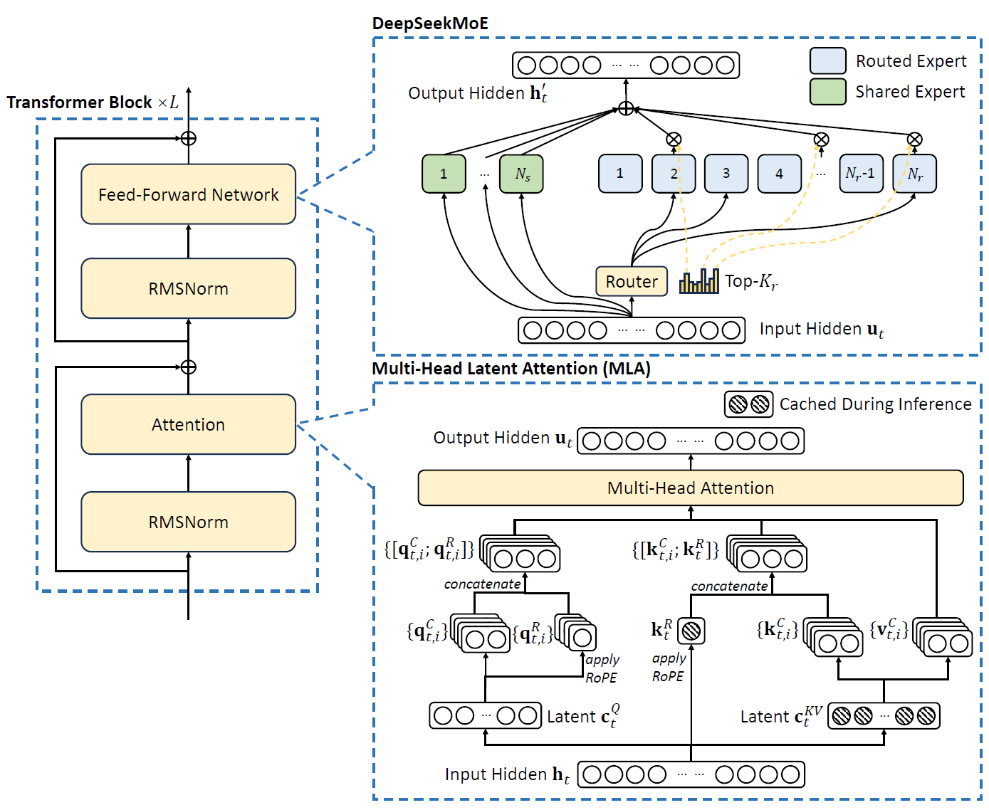 - Multi-Head Latent Attention (MLA): 효율적인 Key-value 캐시를 지원하면서 성능 저하를 최소화하는 Attention layer 구조를 활용
