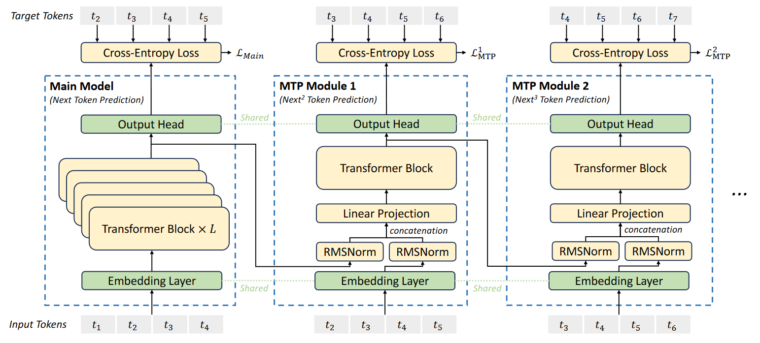 예를 들어 일반적인 언어 모델은 시점 tt에서 토큰 $\text{token}_t$를 입력받아 $\text{token}_{t+1}$을 예측한다. 하지만 Multi-Token Prediction에서는 동일한 $\text{token}_t$에 대해 $\text{token}_{t+1}$, $\text{token}_{t+2}$ 모두를 예측하도록 훈련한다. 이때 각 예측은 별도의 출력 모듈(또는 투영 모듈)을 통해 이루어지며, 여러 단계로 구성된 Transformer Block을 거치면서 순차적으로 추가 토큰을 예상한다.