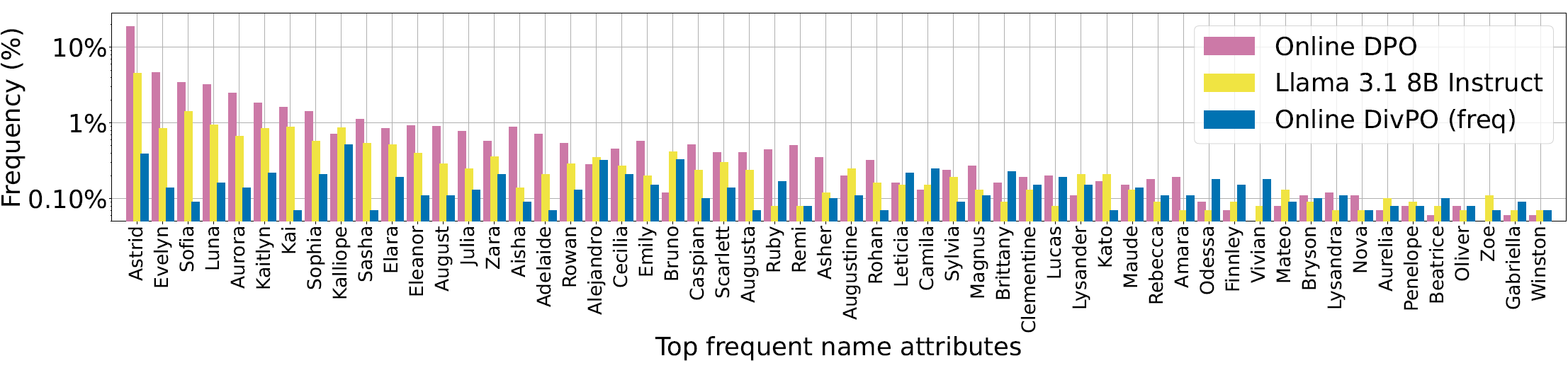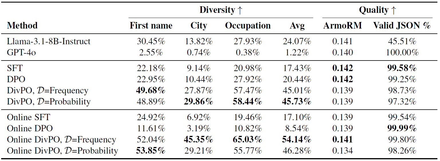 JSON 형식으로 이름, 도시, 직업을 포함한 인물을 생성하도록 하는 태스크를 통해 실험했다. 기존 DPO 방식이나 vanilla LLM 모델은 소수의 이름/직업만 반복적 생성(결과적으로 낮은 diversity)을 보였으나, DivPO는: