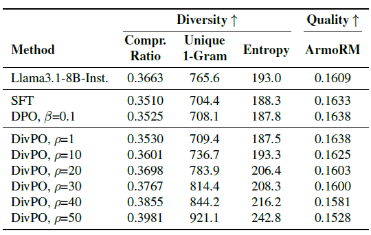 Diverse preference optimization (DivPO)는 퀄리티 + 다양성 두 목표를 함께 달성하고자 하는 학습 기법이다. 기존 DPO 기법은 reward를 기준으로 chosen(고득점)" vs "rejected(저득점)를 구성해 학습한다. 반면, DivPO는 다음과 같은 방식을 도입했다: