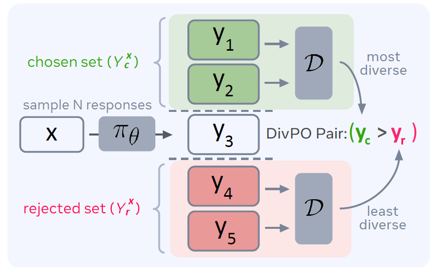 - reward가 상위권(혹은 상위권 근처)인 것 중 가장 diverse한 응답을 chosen으로, reward가 하위권(혹은 하위권 근처)인 것 중 가장 안 diverse한 응답을 rejected로 골라, 한 쌍의 pair를 만든다.