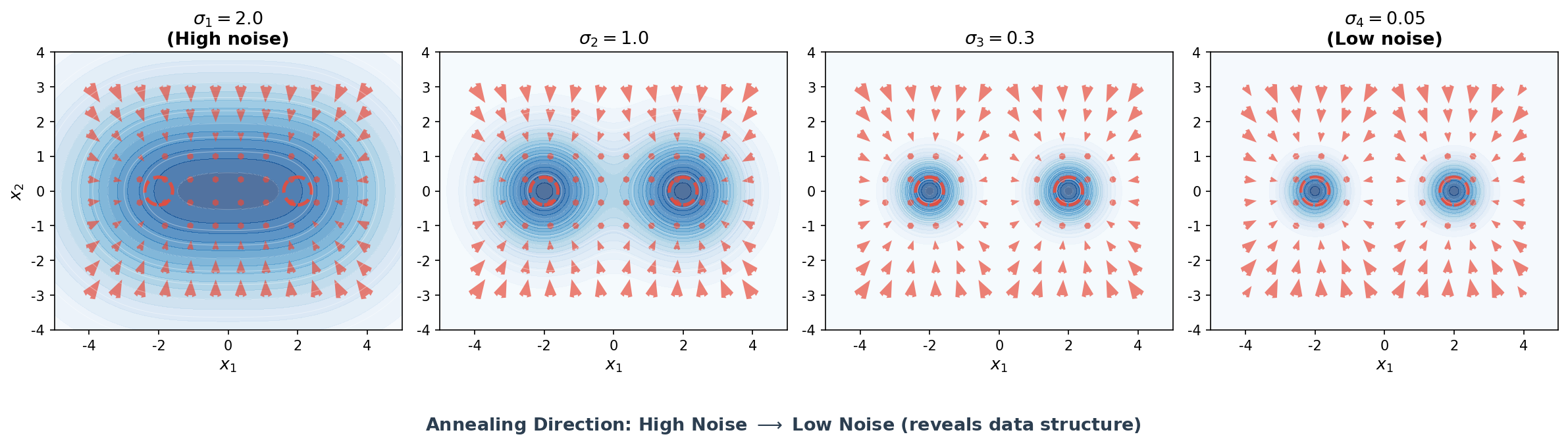 이 절차의 직관은 다음과 같습니다. 높은 노이즈 레벨($\sigma_1$)에서는 분포의 모드들이 뭉개져 있어서 전역적 탐색이 용이합니다. 노이즈 레벨을 줄여가면서 점차 세부 구조를 복원합니다. 최종적으로 낮은 노이즈 레벨($\sigma_L$)에서는 거의 원본 데이터 분포에서 샘플링합니다.