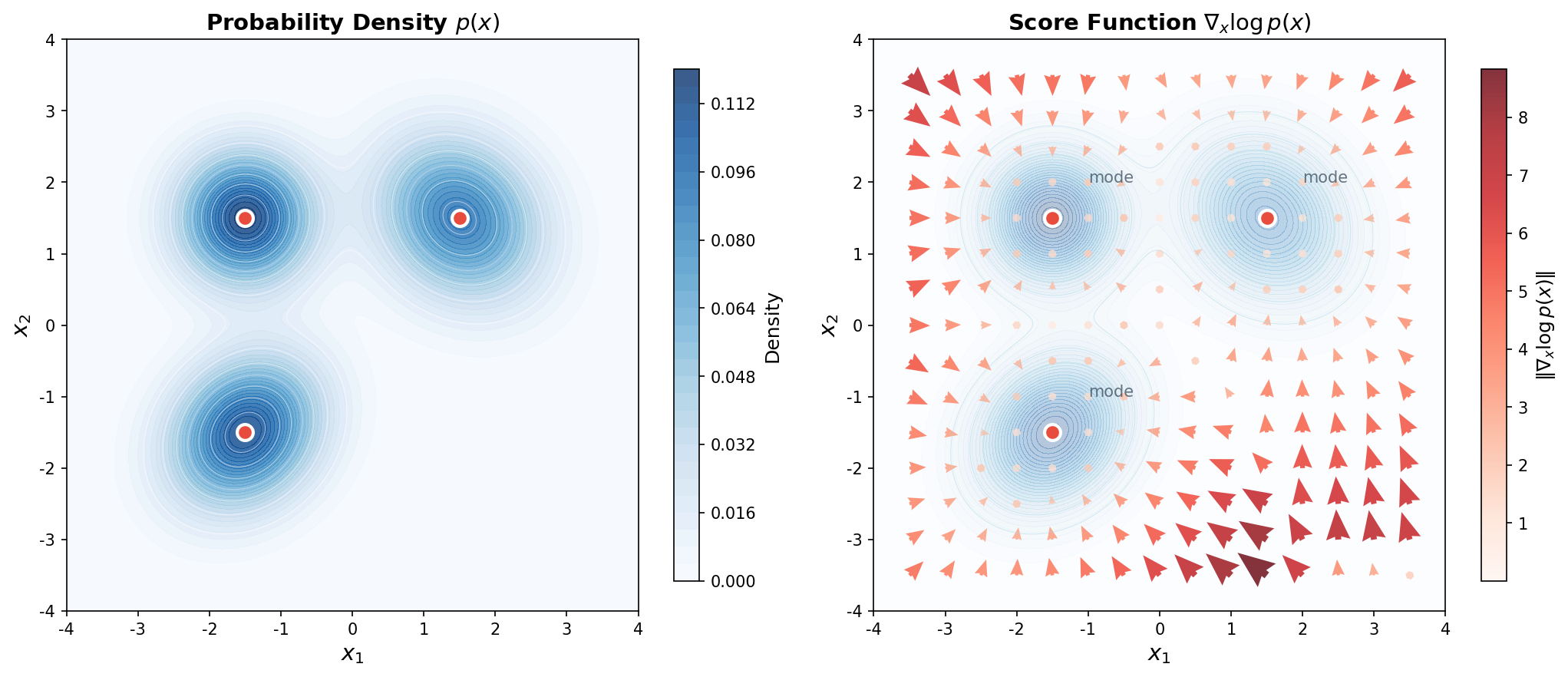 직관적으로, Score Function은 "데이터가 어디에 있는가"를 가리키는 화살표라고 생각할 수 있습니다. 데이터 분포의 모드(mode) 근처에서는 Score가 0에 가까워지고, 모드에서 멀어질수록 Score의 크기가 커지며 모드 방향을 가리킵니다.